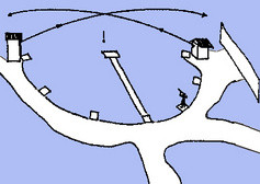 Ampumapaikat, joita on kahdeksan, ovat puoliympyrän kaarella, siten että 1 paikka on korkean tornin juurella ja paikka 7 on matalan tornin edessä, paikat 2 – 6 ovat kaarella noin 8 m etäisyydellä toistaan ja paikka 8 tornien välisellä linjalla keskellä rataa. Ampuja seisoo valmiusasennossa rintamasuunta radan keskelle, pitäen asetta molemmin käsin piippu koholla silmien korkeudella, aseen perä on kiinni vartalossa lonkan korkeudella. Kiekot heitetään ampujan pyynnöstä, 0 – 3 sek kuluessa. Kun kiekko lähtee, ase nostetaan olkaan ja viedään kiekon lentoradan mukaan. Kun kiekko saavutetaan ja päästään sen ohi eli saadaan ns. ennakkoa, laukaistaan ase.